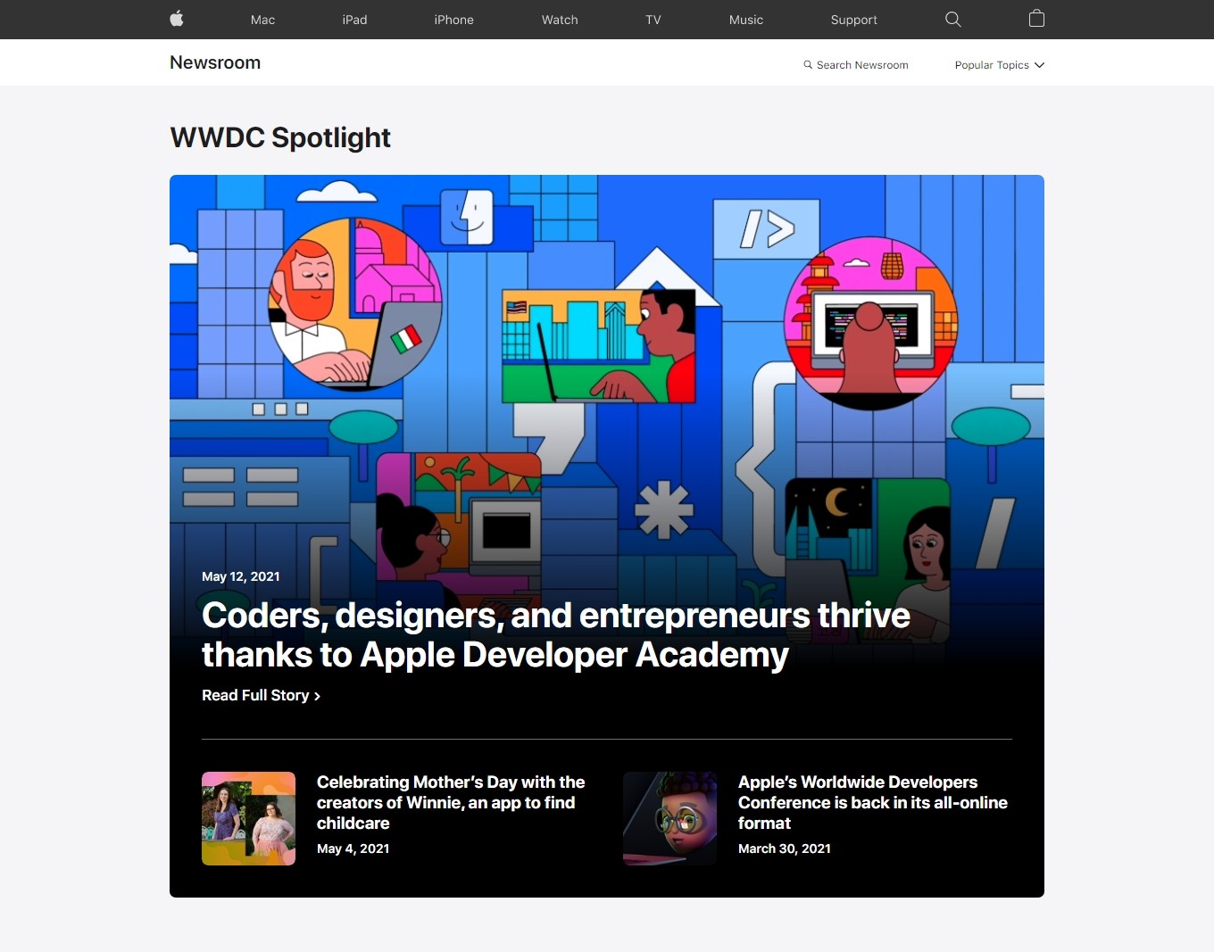 2021년 6월 8일 오전 2시 (국내 시간)에 진행되는 WWDC 21이 23일 남은 상황에서 Apple Newsroom 메인 페이지가 WWDC Spotlight로 변경되었습니다.