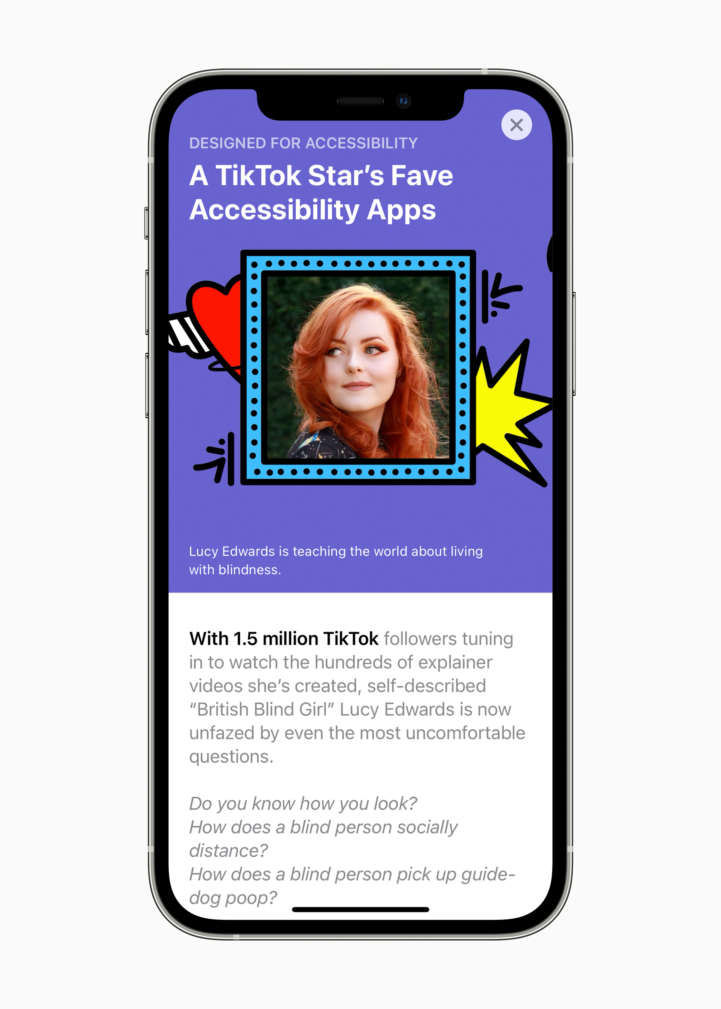 • App Store에서 고객들은 시각 장애인으로 틱톡의 인플루언서로 시각 장애가 있는 필름 메이커들이 가장 사용하기 쉬운 동영상 앱 중 하나면서 자신이 가장 즐겨 쓰는 손쉬운 사용 앱인 App of the Day FiLMiC Pro에 관한 콘텐츠를 공유하고 있는 루시 에드워즈에 관한 스토리를 읽어볼 수 있고, 새로운 Express Yourself Your Way 컬렉션에서 더 많은 사람들의 스토리도 읽어볼 수 있다.