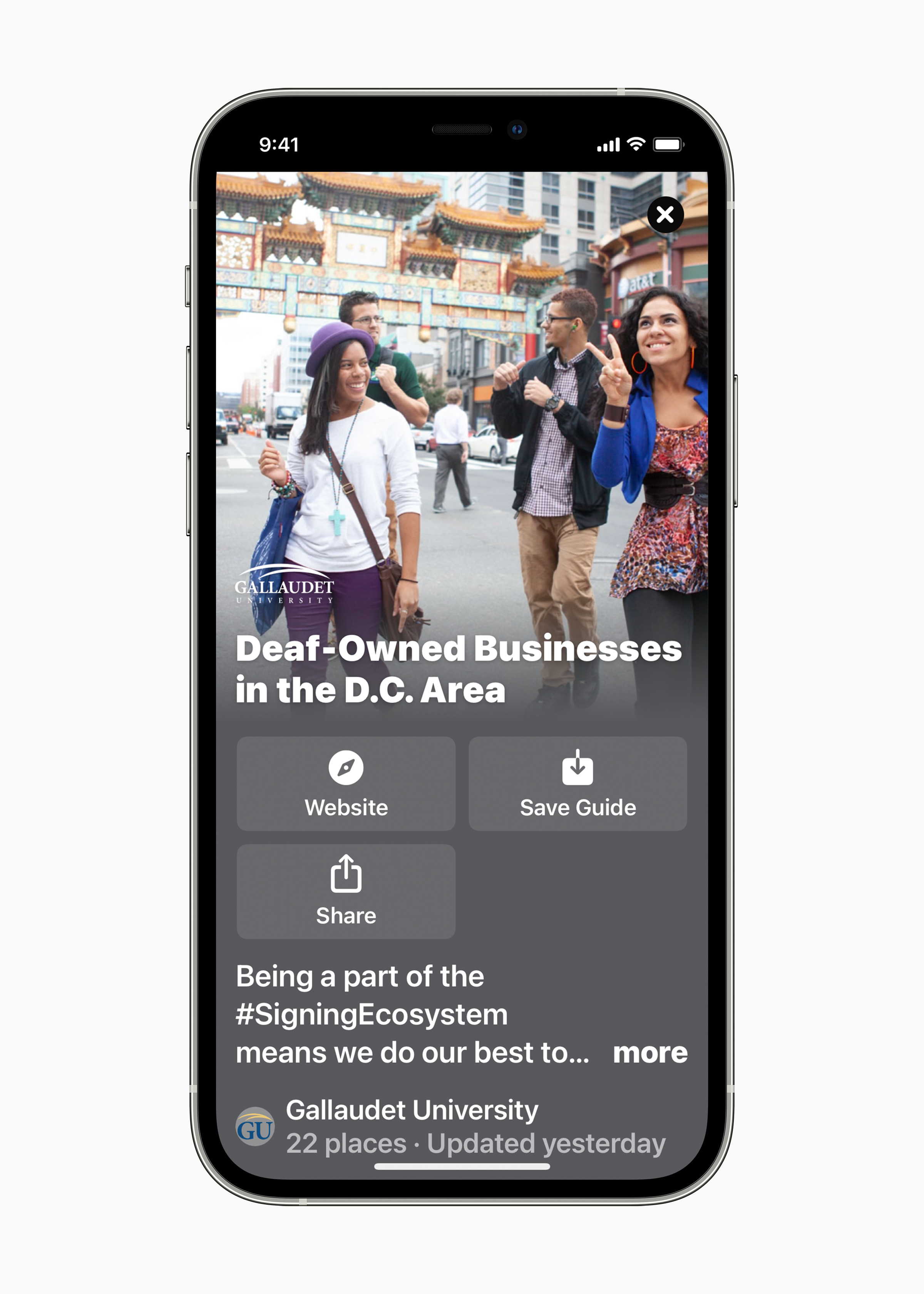 • Apple 지도에서는 청각 장애 및 시청각 장애를 가진 학생들을 위한 세계 최고 수준의 대학인 갤로뎃 대학의 새로운 가이드를 제공한다. 이 기능은 사용자들을 청각 장애인 커뮤니티 및 수어의 가치를 인정하고, 이들을 포용하고, 이와 관련한 우선 정책을 시행 중인 기업과 기관에 연결해준다.