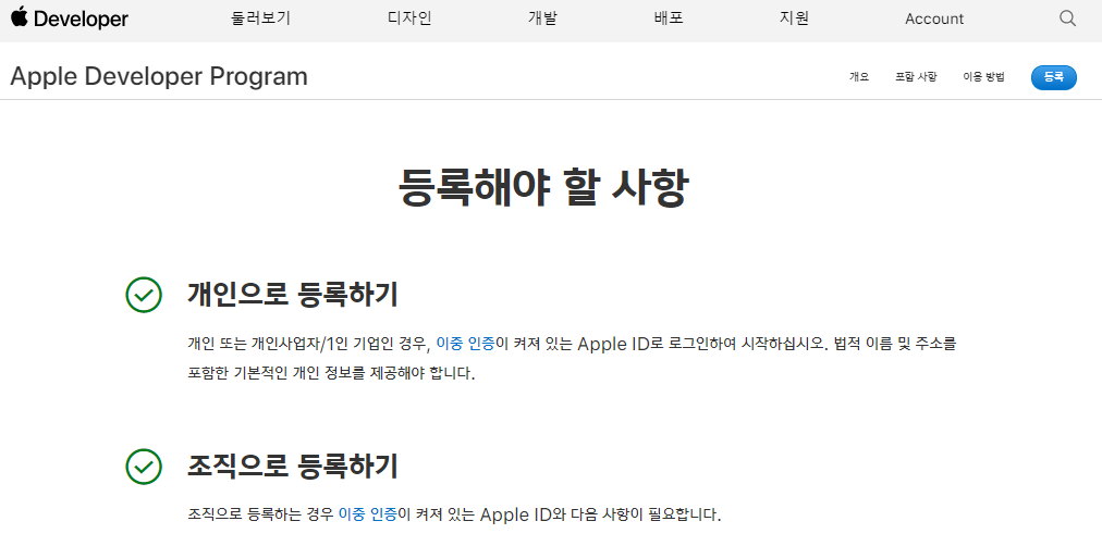 개발자 베타의 경우 Apple Developer Program을 등록 (1년에 99 USD)하여, 개발자 계정을 활성화 한 이후, Developer 버전의 Beta를 설치하는 것이다. 기업 또는 조직으로 등록하며, 개인의 경우 1인 사업자로 등록을 하게 된다.