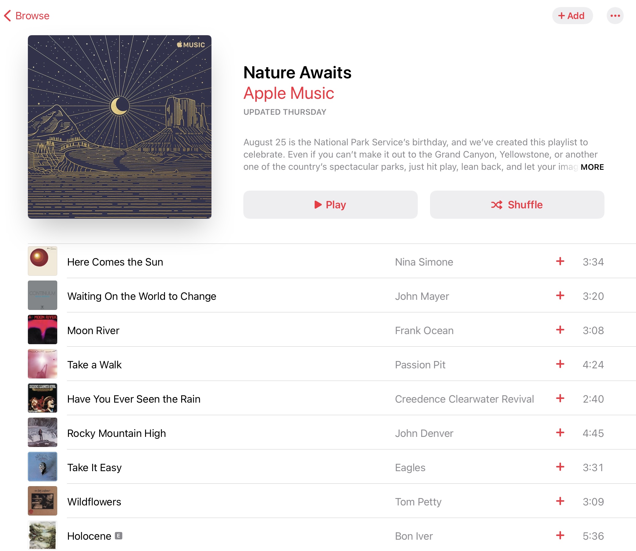Apple Music은 업데이트된 Nature Awaits 재생 목록을 제공하여 사용자가 공원에 갈 수 없더라도 재생하여 상상 속에서 경험할 수 있도록 해줍니다.