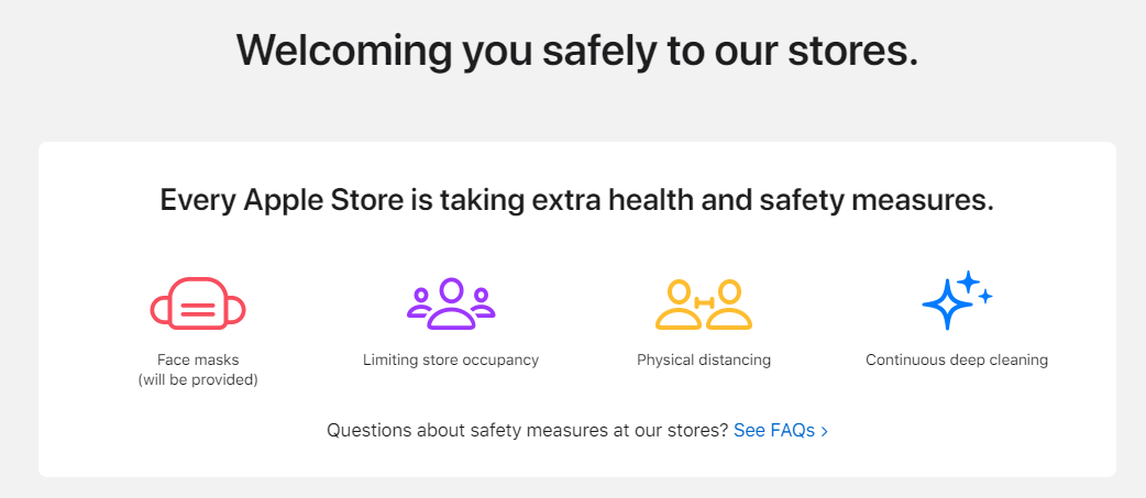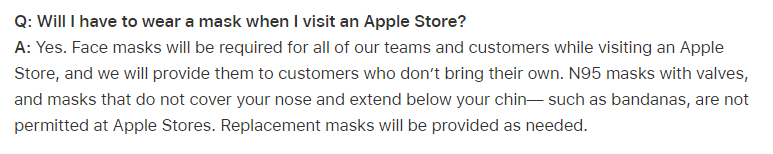 애플은 현재 내부 방침에 따라 미국 Apple Store 내 마스크 착용을 권장하고 있으며, 미착용 고객에게는 N95 등급의 마스크를 제공하고 있다고 밝혔습니다. (대한민국은 마스크 필수 착용)