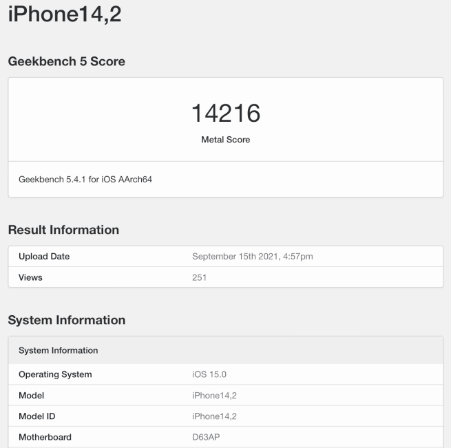 긱벤치에 등록된 iPhone 13 Pro의 긱벤치 Metal 벤치마크에서 14216점이 나왔습니다.