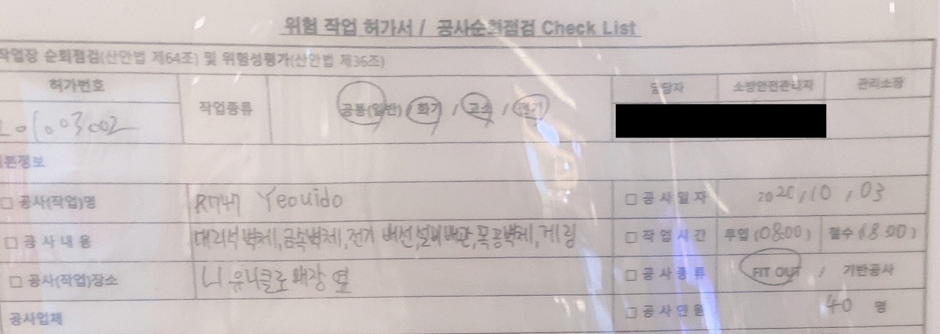공사 현장 앞에 있는 위험 작업 허가서를 보면 시공사가 국보디자인입니다. 이 회사는 지난번 Apple 가로수길의 인테리어 시공을 담당했던 회사이기도 합니다.