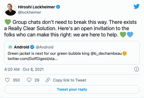 Hiroshi Lockheimer는 자신의 트위터를 통해 안드로이드와 iOS 사용자들이 메시지를 통해 소통하는 데 있어 불편한 점을 언급하면서 "이런 식으로 그룹 채팅을 못하게 할 순 없다"라고 말했습니다. Lockheimer는 RCS 프로토콜을 언급하면서 "정말 명확한 해결법"이 있으며 "이를 바로잡을 수 있는 사람들에게 제안한다"라고 밝혔습니다. 여기서 사람들은 애플인 것을 알 수 있습니다.
