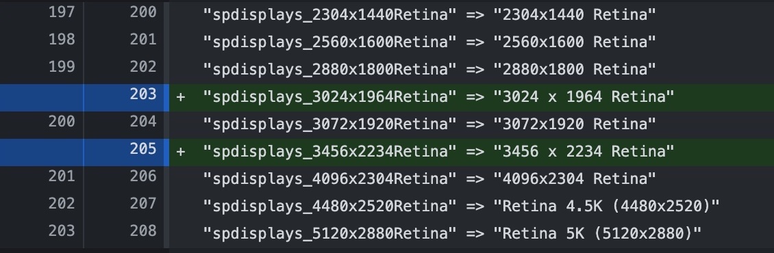 또한 macOS Monterey에서 유출된 MacBook Pro 해상도의 높이에서 74를 빼면 3024 x 1890과 3456 x 2160이 되며 이는 기존 MacBook Pro에서 사용하던 16 : 10 비율과 동일한 것을 보았을 때 실제로 노치가 사용될 가능성이 매우 높아 보입니다.