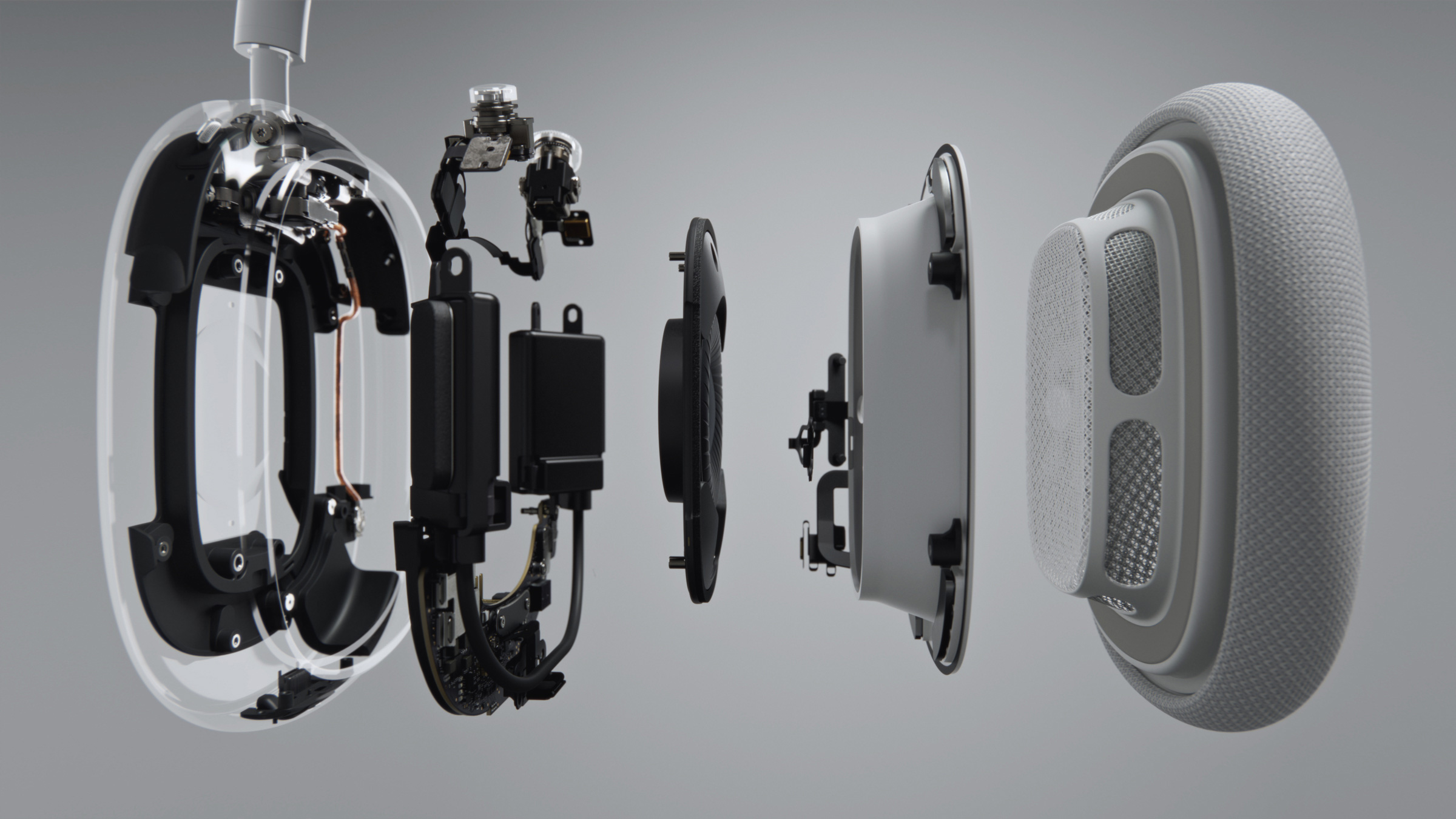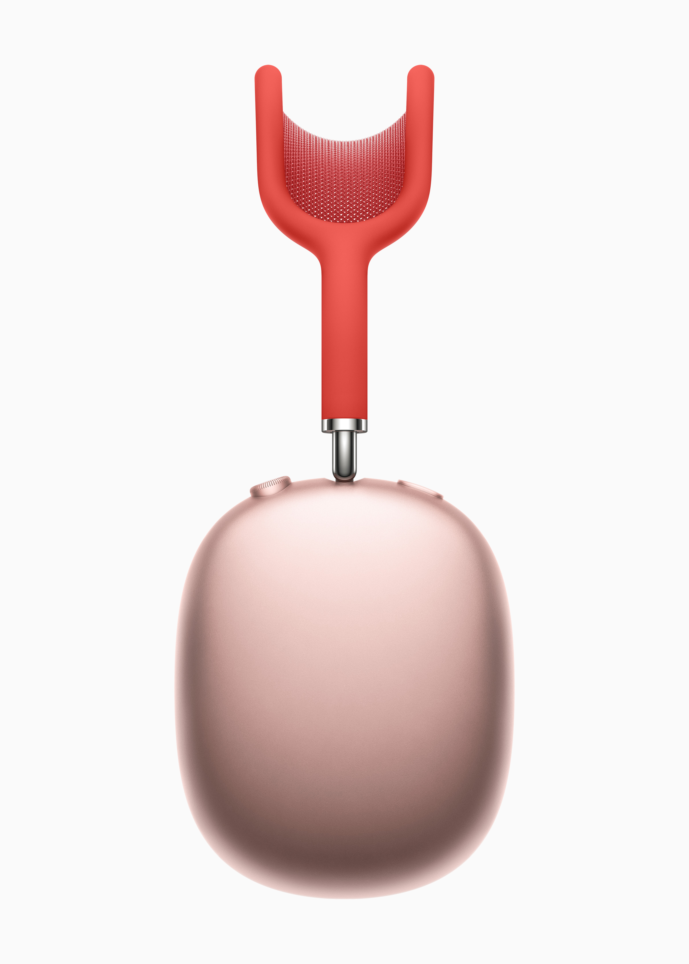정말 신선한 형태이다. 다른 기기들은 두툼한 가죽 쿠션을 덧대거나 실리콘으로 머리에 착 감기에 설계되었는데, 에어팟 맥스는 이 둘을 합치고, 니트 메시 소재를 더했다. 유연하게 늘어나는 니트 메시 소재의 캐노피가 착용감을 높여주고, 무게 분산을 적절히 해줄 것이다.