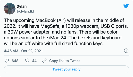애플의 계획에 대한 정보를 정확히 맞춘 실적이 있는 유출가 Dylandkt의 트윗에 따르면 MacBook Air 2022는 새로운 MacBook Pro에 추가된 기능 몇 가지가 적용될 것으로 보입니다.