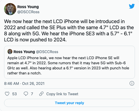 믿을 수 있는 디스플레이 분석가 Ross Young은 트위터를 통해 2022년 출시될 iPhone SE는 “Plus” 이름을 사용할 것이며, 5G를 지원하고 기존 폼팩터를 사용해 4.7인치 디스플레이를 탑재한다고 밝혔습니다. 또한 더 큰 디스플레이를 탑재하고 5G를 지원하여 출시되는 iPhone SE 3는 2024년에 출시될 것이라고 덧붙였습니다.