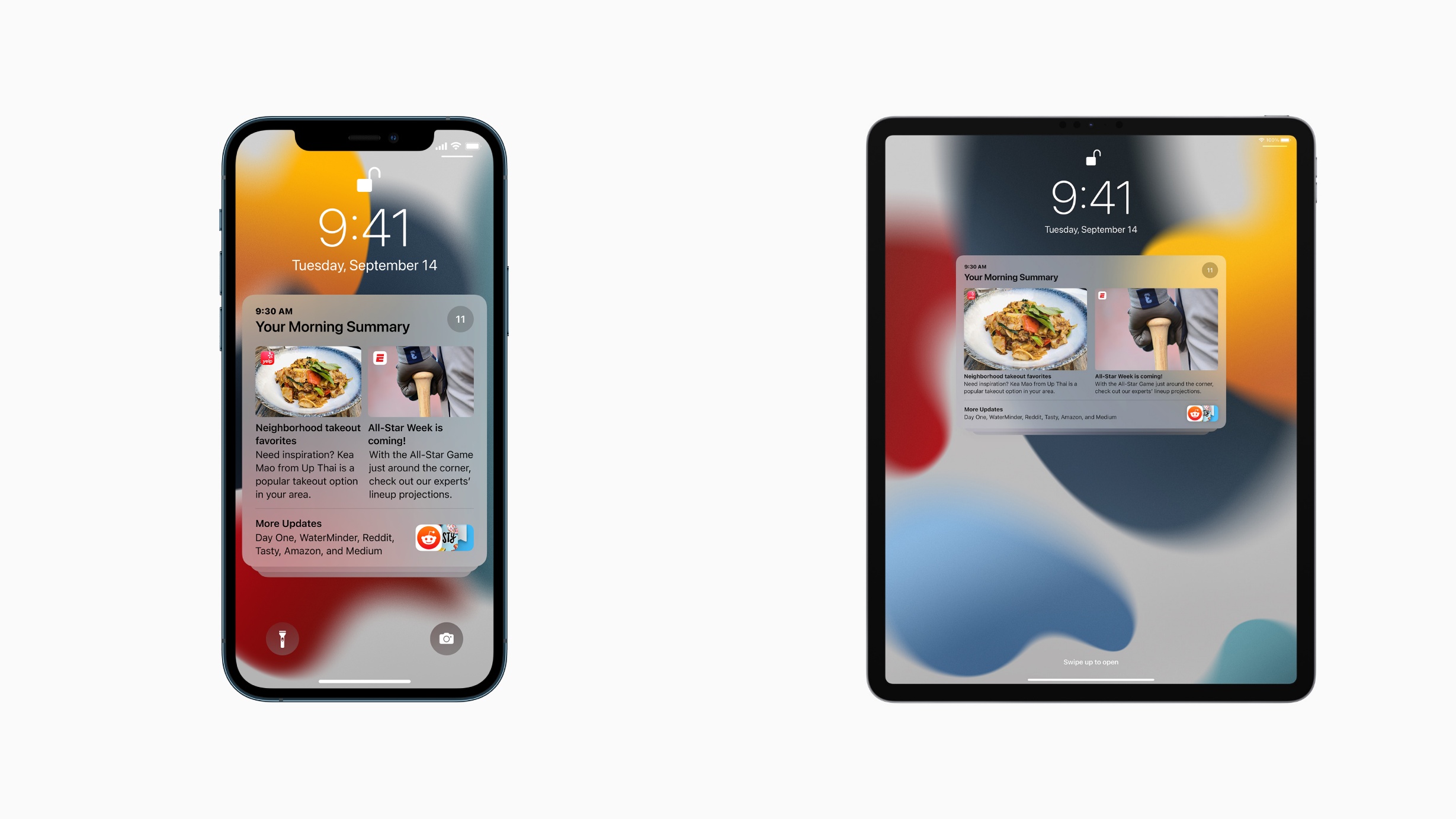 사진을 통해 볼 수 있듯이, 새로운 알림 요약의 UI는 전체적으로 투명도가 조절되었습니다. 알림 요약 안에도 앱 아이콘 색상으로 플로팅 카드도 새로 추가되었으며, 전체적인 디자인이 iOS 15에서 적용되었던 UITableView Inset Grouped Style과 맞춰졌습니다.