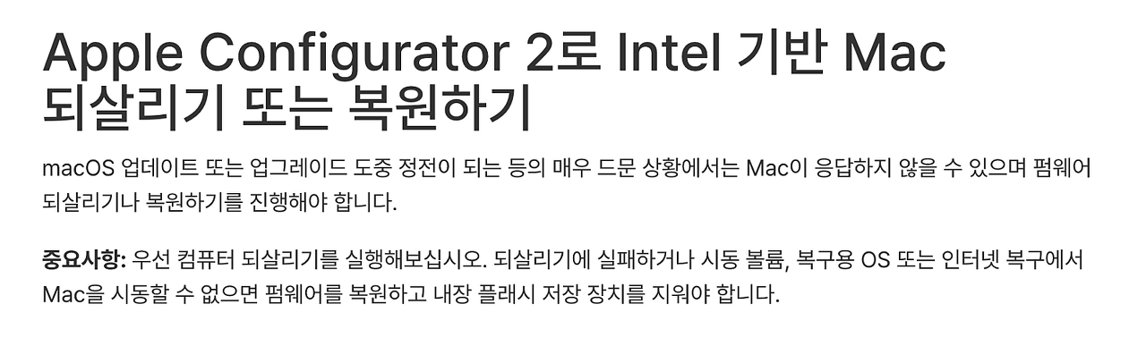 현재 Apple 지원 커뮤니티에서 답변되고 있는 한 가지 방법은 사용자가 Mac의 펌웨어를 다시 복구할 수 있다는 것입니다. Apple 지원 문서에 따르면, Apple Configurator 2로 Intel 기반 Mac을 되살릴 수 있다고 합니다. Apple은 “macOS 업데이트 또는 업그레이드 도중 정전이 되는 등의 매우 드문 상황에서는 Mac이 응답하지 않을 수 있으며 펌웨어 되살리기나 복원하기를 진행해야 합니다.”라고 설명했습니다. Apple은 복원하기 방법을 사용하기 전에 되살리기 방법을 시도하라고 권장하고 있습니다.