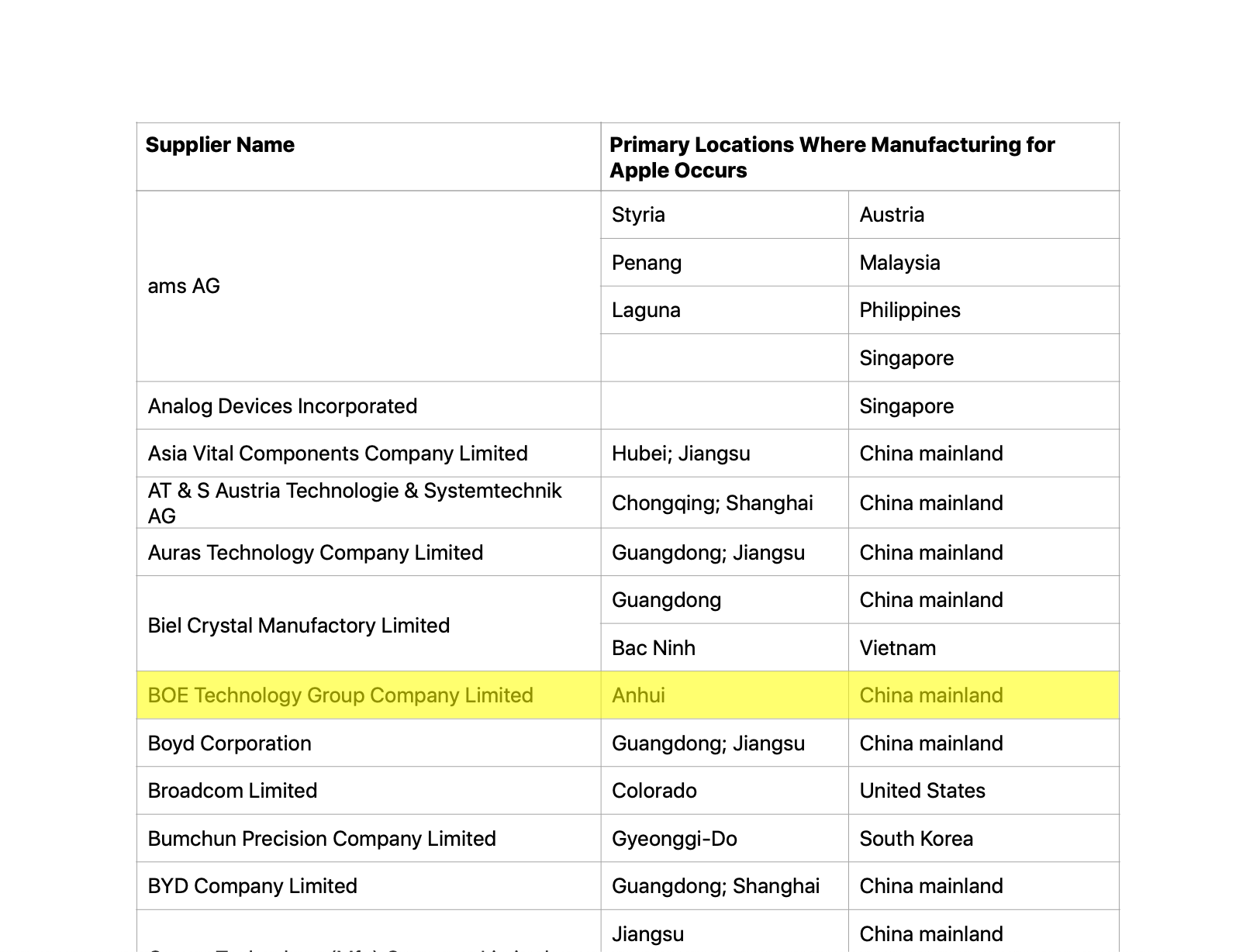 Apple은 새로운 공급업체 목록에 중국 안후이성에 위치한 “BOE Technology Group Company Limited”를 추가한 것으로 알려졌습니다.