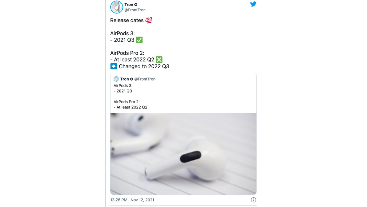트위터 사용자 @FronTron은 이미 지난 6월 자신의 트위터를 통해 AirPods 3세대가 2021년 3분기에, AirPods Pro 2세대가 2022년 2분기에 출시될 것이라고 공개했었습니다. AirPods 3세대가 2021년 3분기에 출시될 것이라는 정보는 완전히 적중했으며, Tron은 오늘 또 한 번 트위터를 통해 AirPods Pro 2세대는 2022년 3분기로 연기되었다고 밝혔습니다. 3분기 기간은 주로 7~9월 사이를 의미합니다. 따라서 9월 또는 10월 Apple Event에서 공개될 가능성이 높은 것으로 보입니다.