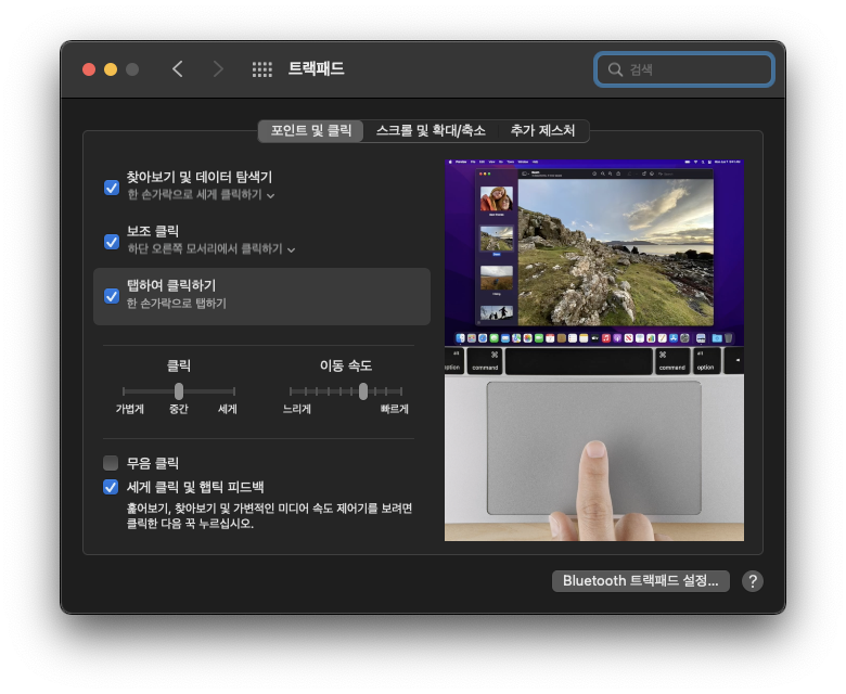 탭 하여 클릭하기는 시스템 환경설정 > 트랙패드 > 포인트 및 클릭에서 설정할 수 있습니다.
