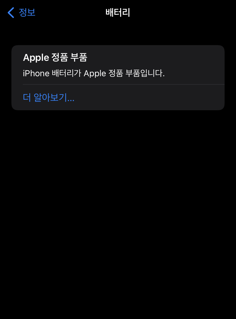 Apple 정품 부품 및 도구를 사용하여 수리한 경우 부품 이름 옆에 “정품 Apple 부품”이 표시됩니다. 하단에는 "부품 및 서비스 기록은 Apple에서 수집하며, iPhone의 상태 및 수리 기록에 관한 상세한 정보를 보여줍니다."라는 문구도 표시됩니다.