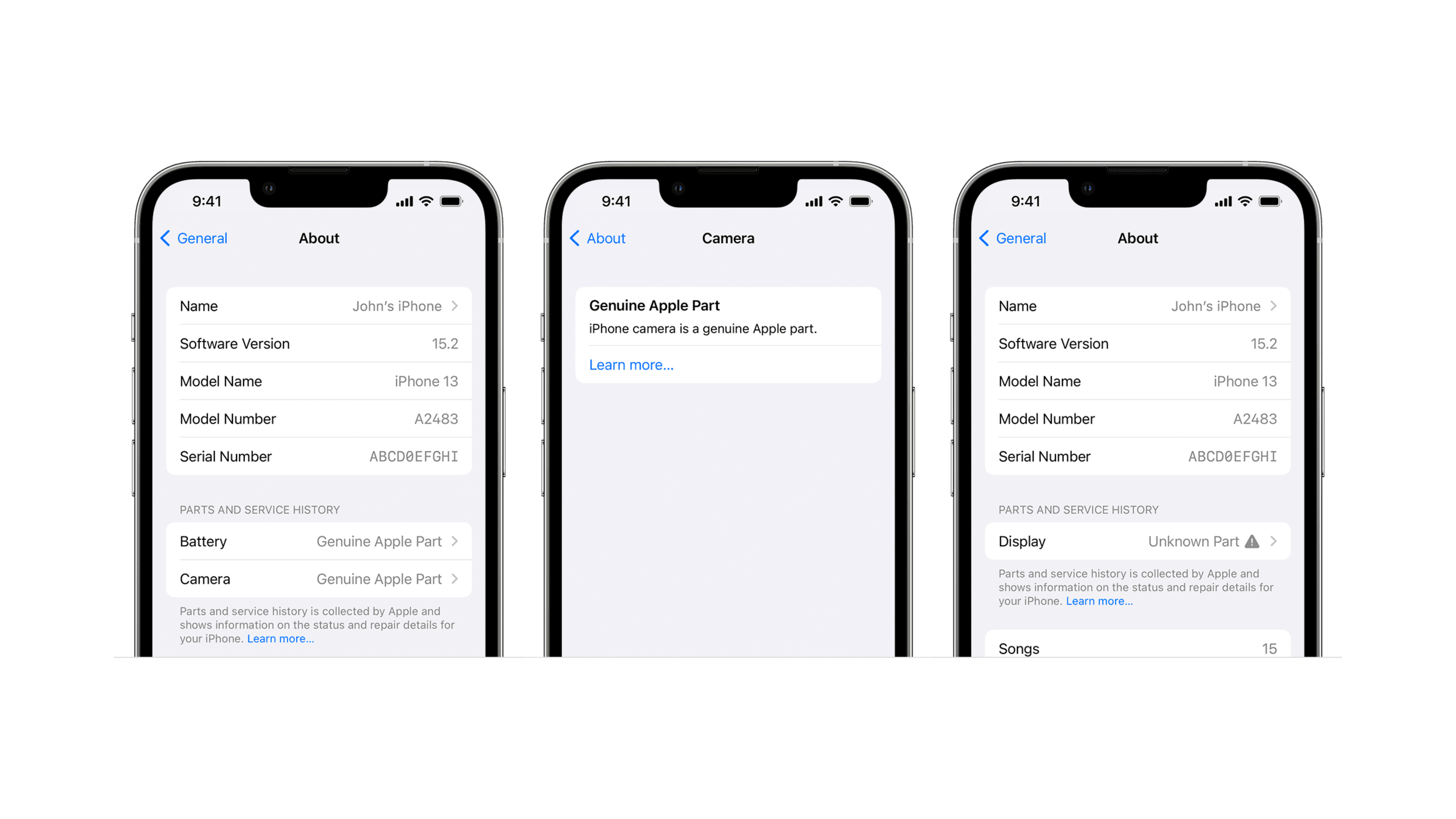 iOS 15.2 이전 버전을 사용하는 경우, 사용자는 교체된 부품이 알 수 없는 부품인지만 확인할 수 있습니다.