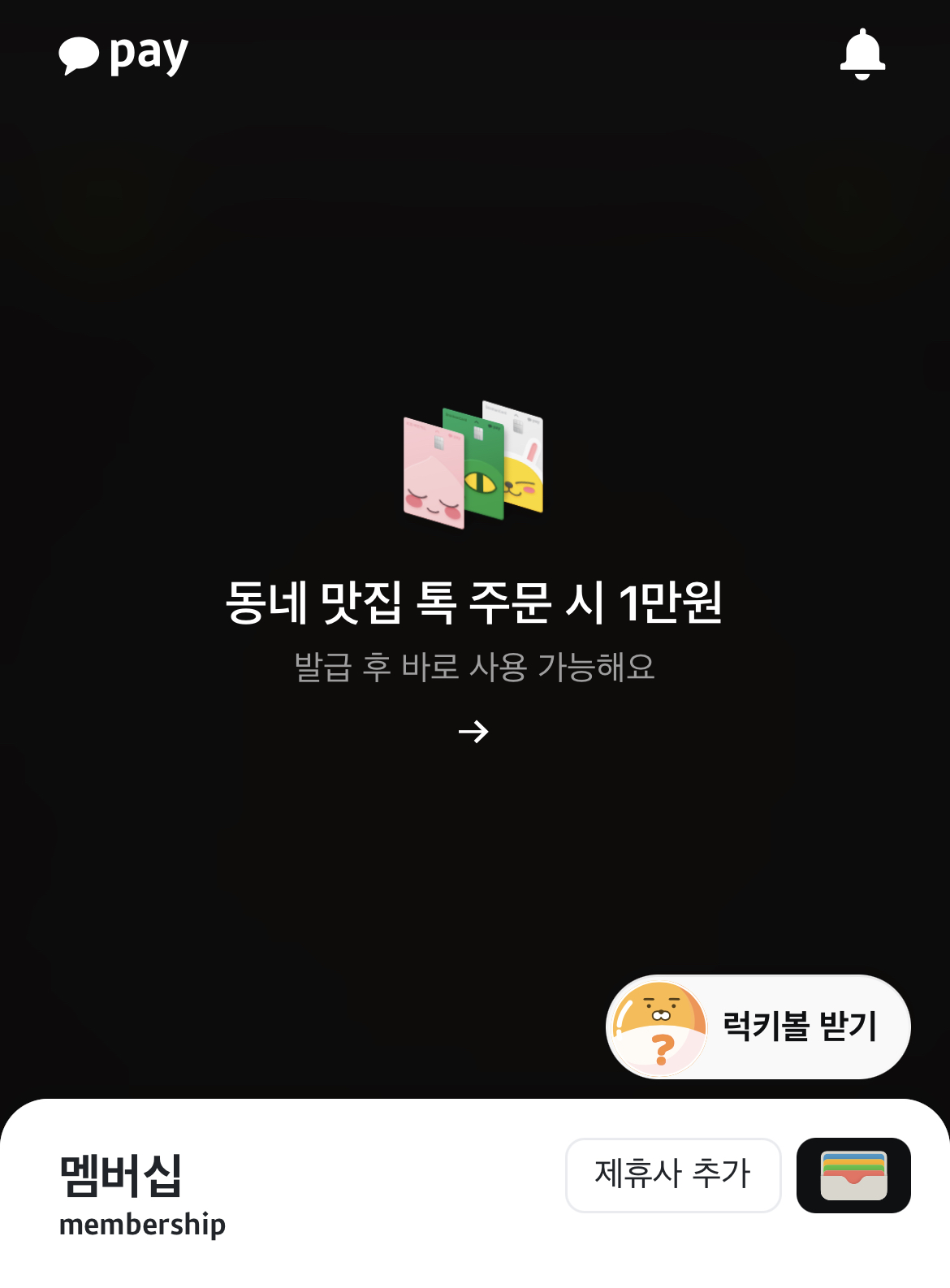 카카오페이를 App Store에서 최신 버전 (1.16.0)으로 업데이트한 후, 결제 탭에서 멤버십 항목 옆에 위치한 Apple Wallet 아이콘을 터치해 추가할 수 있습니다.