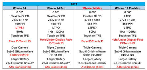 올해 하반기 출시될 iPhone 14 라인업의 자세한 모델 구성은 iPhone 13 라인업과는 다를 것이 유력합니다. iPhone 14에서는 iPhone 14 mini 모델이 출시되지 않고 iPhone 14 Max라는 새로운 라인업이 추가되어 일반 라인업은 6.1형 디스플레이의 iPhone 14와 6.7형 디스플레이의 iPhone 14 Max, Pro 라인업은 6.1형 디스플레이의 iPhone 14 Pro와 6.7형의 iPhone 14 Pro Max로 구성될 것으로 보입니다.