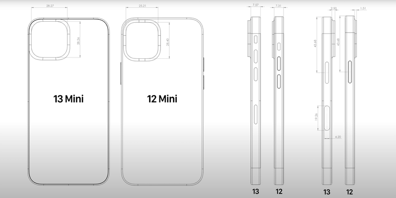 유출된 CAD에 따르면, iPhone 13 mini와 iPhone 13 Pro Max는 카메라 범퍼가 완벽한 정사각형이 되고, iPhone 13 Pro Max의 카툭튀는 기존 iPhone 12 Pro Max보다 0.87mm 더 두꺼워지며, 전체 두께는 0.25mm가 더 두꺼워질 예정입니다.