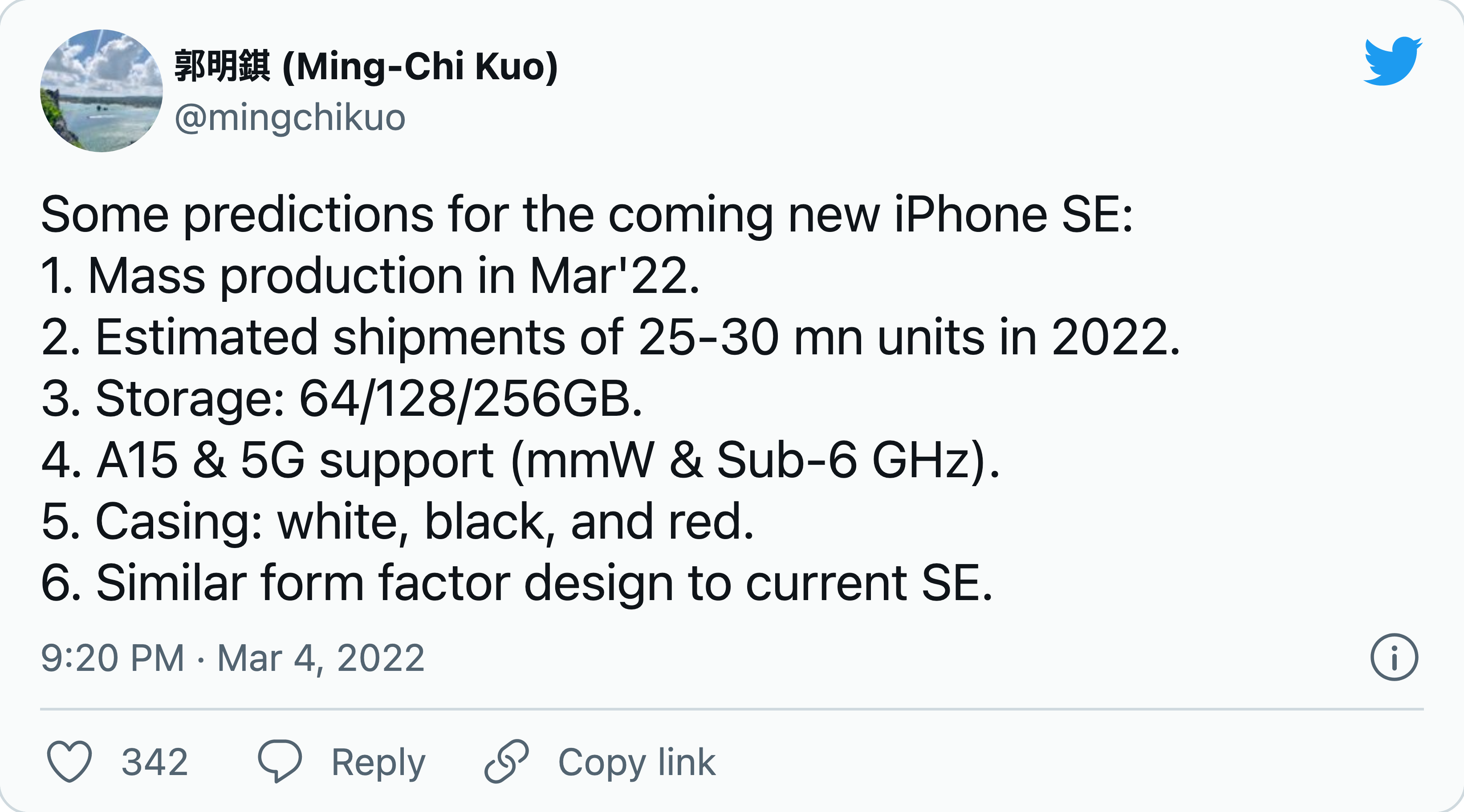 적중률 70%의 대만의 Apple 유출가인 대만의 궈밍지가 트위터를 통해 3세대 iPhone SE에 대한 6가지 정보를 공개했습니다. 이전 주장과 동일하게 궈밍지는 iPhone SE 3세대가 A15 Bionic을 탑재하고 5G를 지원하며 기존 iPhone SE 2세대와 유사한 폼팩터를 사용할 것이라고 말했습니다. 또한 이전까지 없던 새로운 내용도 함께 공개했습니다.