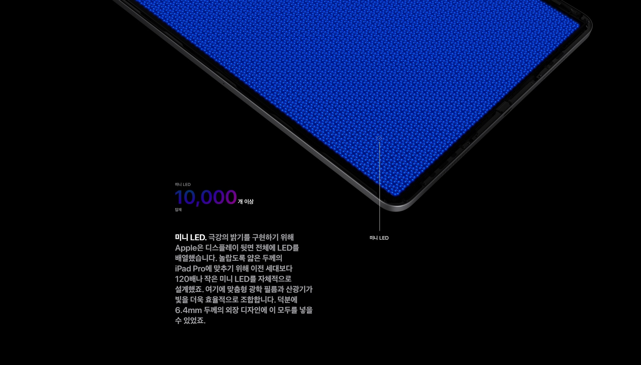 10,000개가 넘는 Mini-LED가 2500개의 로컬 디밍 존으로 그룹화되어있는 이 디스플레이는 100만:1이라는 엄청난 명암비를 자랑합니다.