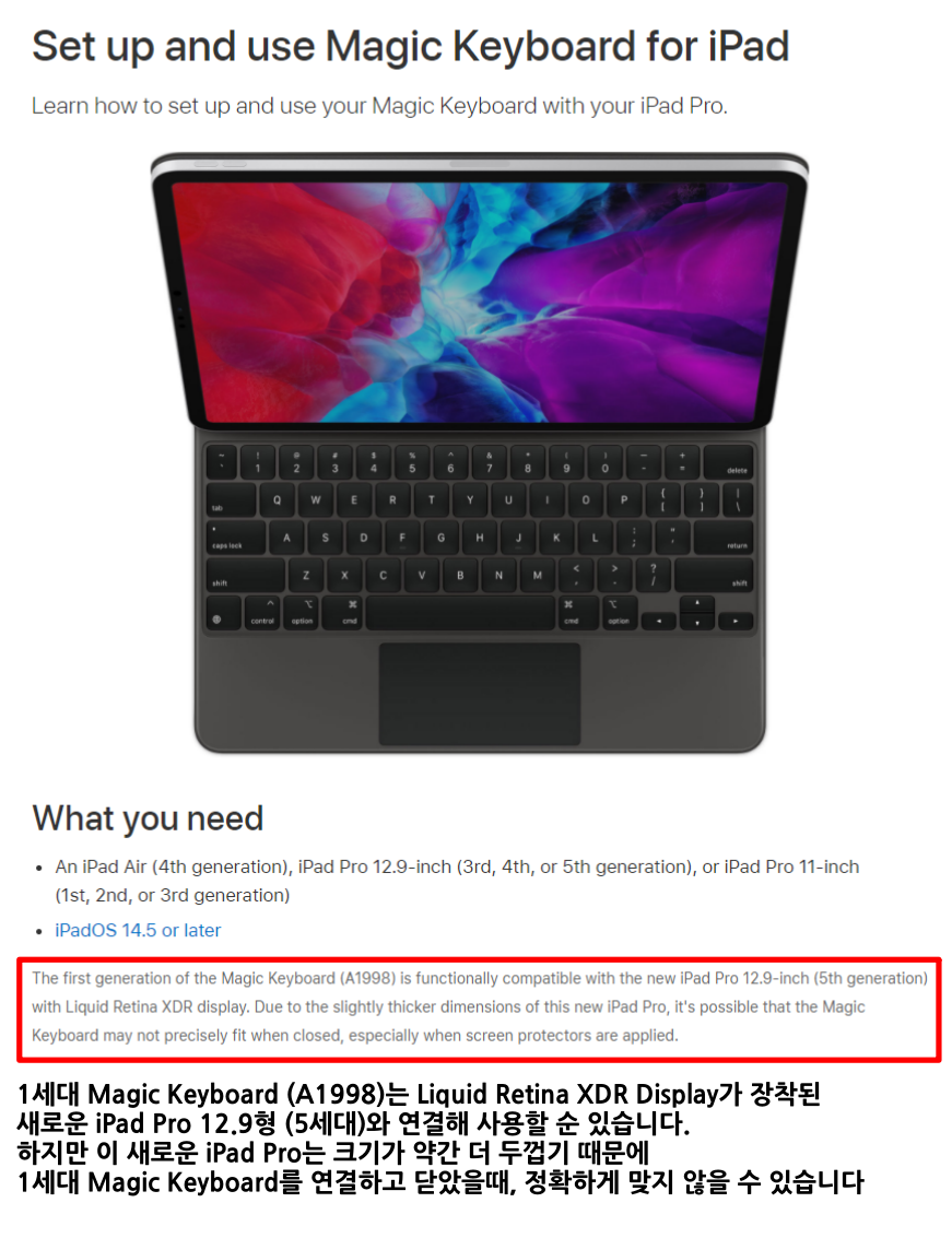 APple은 공식 지원 문서를 통해 아래와 같이 공개했습니다. (1세대 Magic Keyboard는 12.9형 iPad Pro 4세대와 함께 공개된 제품을 의미함)
