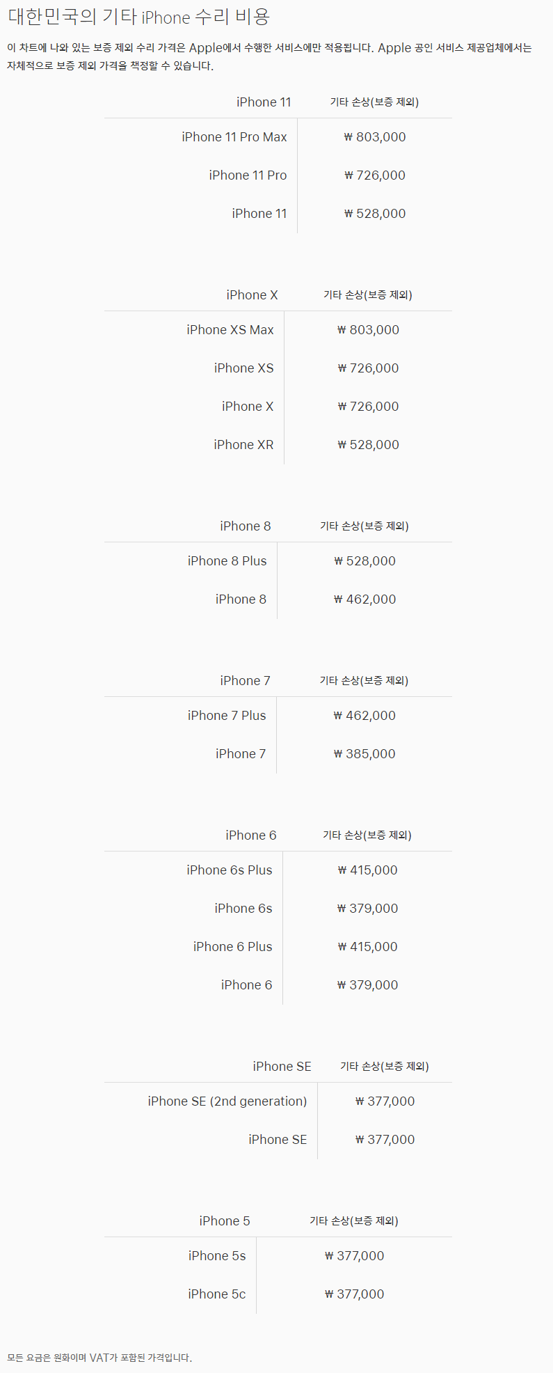 다만 Apple 공인 서비스 센터는 Apple 직영이 아니기에, 위 표에 나와있는 가격에서 추가 공임비를 부과합니다. 대체로 10퍼센트 정도이며 8.8만 원 서비스의 경우 9만 원 중반에 서비스를 받으실 수 있습니다. (20년 기준이며, 신규 제품 및 최신 가격에 대해선 확인 필요)