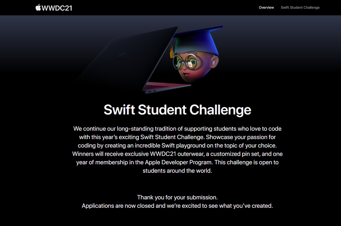 올해도 마찬가지로 Swift Student Challenge를 진행합니다. Swift Student Challenge는 13세 이상의 학생이 Swift를 통해 개발하고 소개하는 챌린지로 우승자는 1년 치 개발자 라이선스 등록비 지원, WWDC21 한정 겉옷 등이 주어집니다.