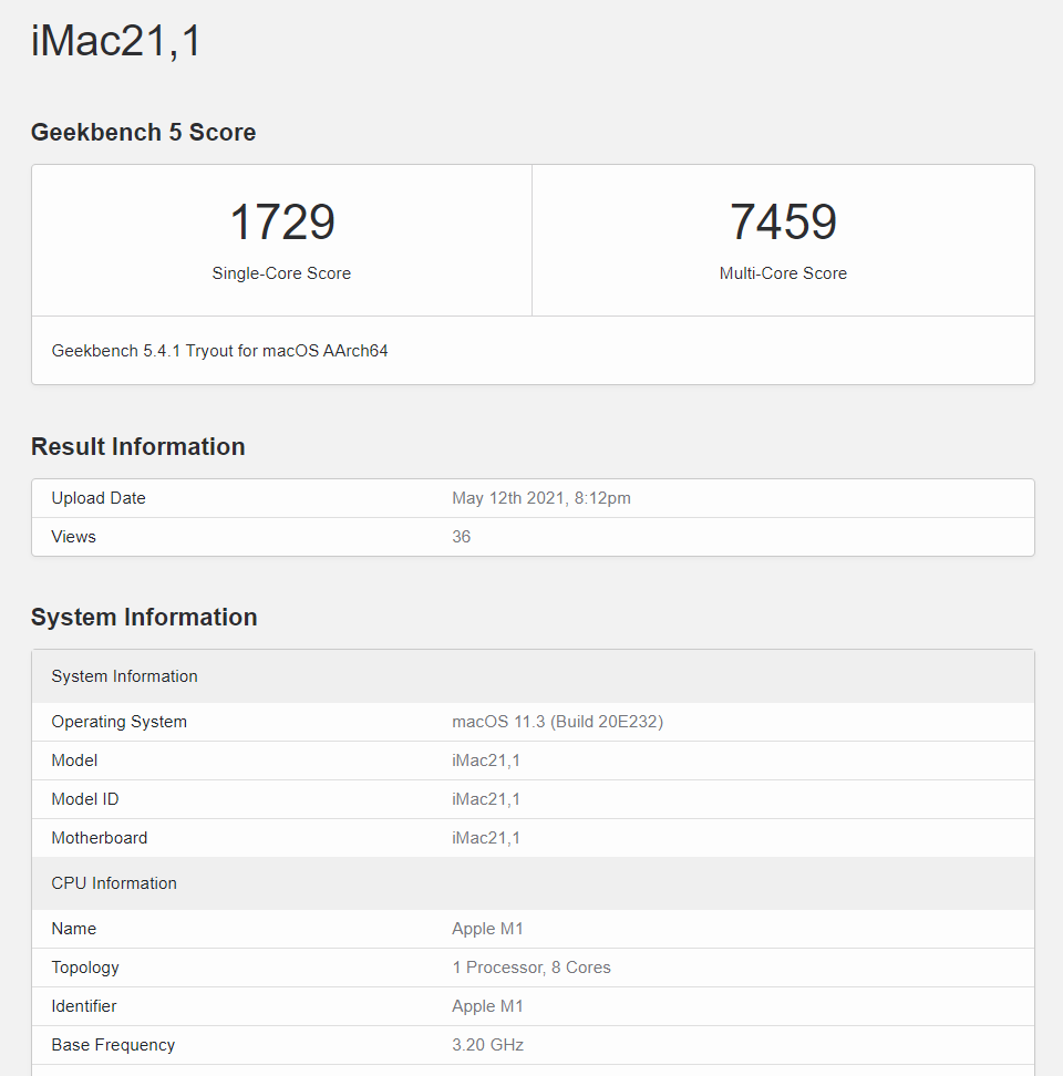 현재 공개적으로 기록된 벤치마크 결과는 3개밖에 없으며, 3개의 기기 모두 8코어 CPU, 7코어 GPU 및 2개의 ThunderBolt 포트가 있는 기본형 M1 iMac이며 모든 기기에는 macOS Big Sur 11.3이 설치되어 있습니다.