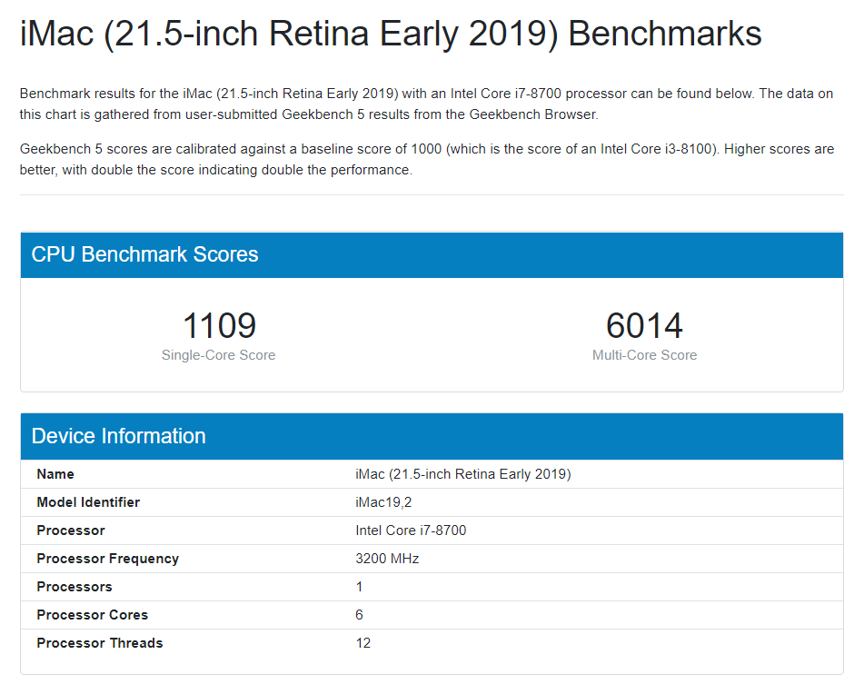 M1 iMac은 2019년 출시된 21.5형 Retina 4K 디스플레이 iMac의 성능을 크게 능가합니다. 2019년식 21.5형 Intel i7-8700가 탑재된 최고급 옵션 iMac의 벤치마크는 싱글 코어 1,109점과 멀티 코어 6,014점을 기록했었으며, M1 iMac은 이전 세대 i7-8700 최고급 모델 대비 싱글 코어 56%, 멀티 코어 24%가 향상된 성능을 보여줍니다.
